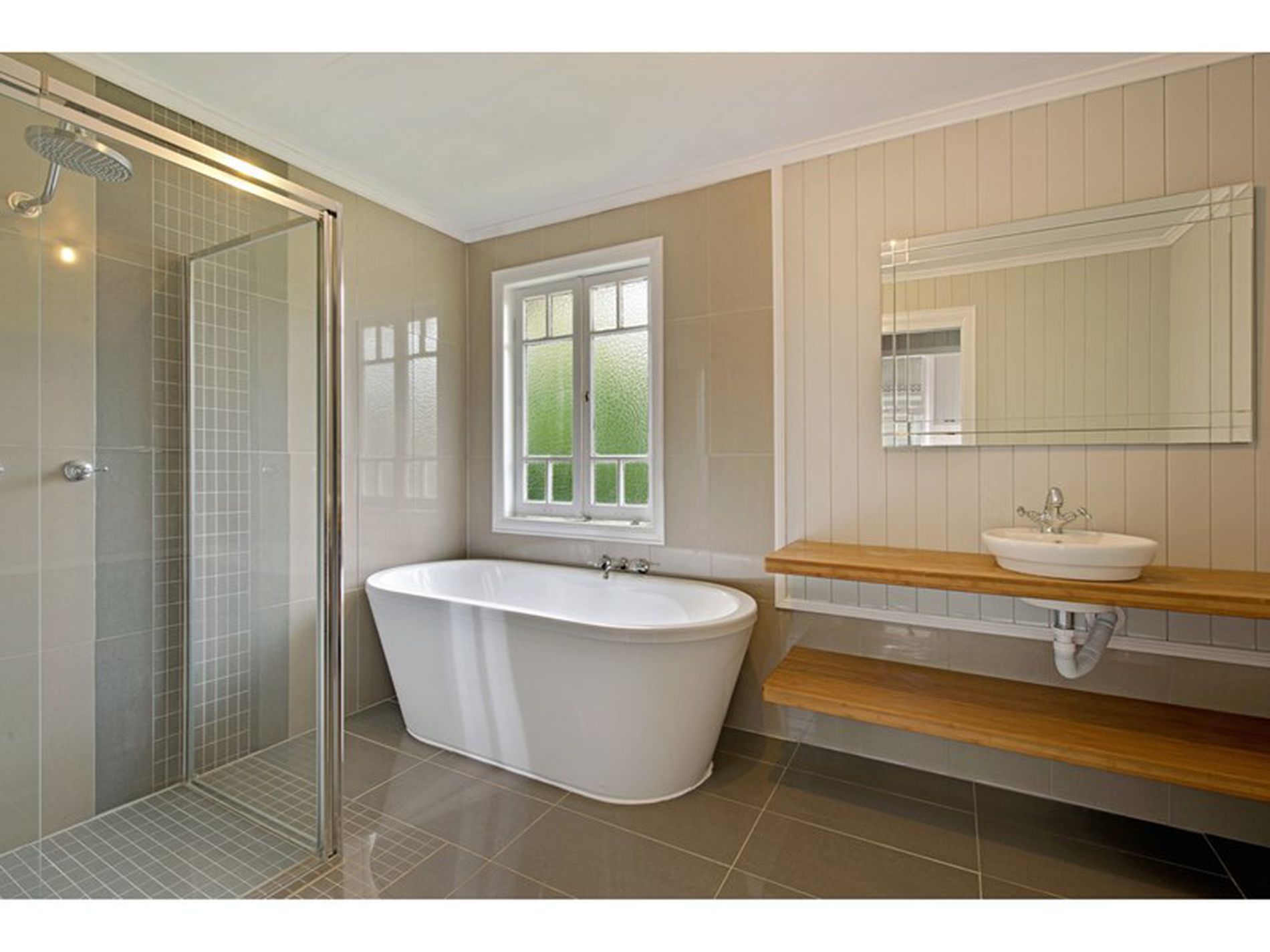 - Stylish bathroom with lovely deep bathtub for soaking the hours away